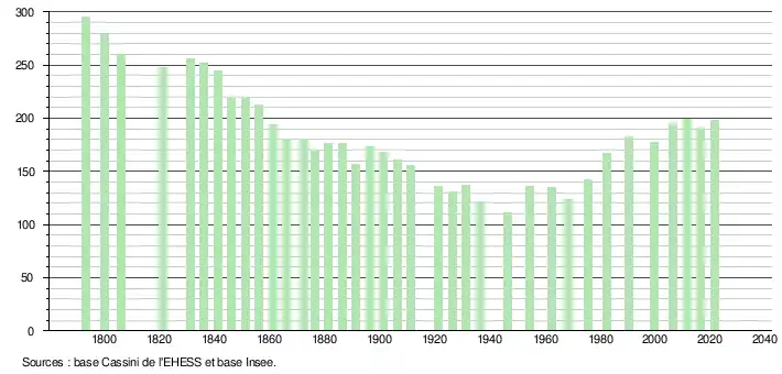 L'évolution du nombre d'habitants est connue à travers les recensements de la population effectués dans la commune depuis 1793. Pour les communes de moins de 10 000 habitants, une enquête de recensement portant sur toute la population est réalisée tous les cinq ans, les populations légales des années intermédiaires étant quant à elles estimées par interpolation ou extrapolation[21]. Pour la commune, le premier recensement exhaustif entrant dans le cadre du nouveau dispositif a été réalisé en 2006[22].