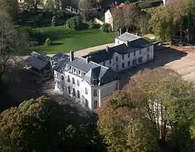 - Il fut édifié au début XVIIIe siècle à l'emplacement de l'ancien manoir des Rubentel, dont il ne reste aucune trace. Il se caractérise par une étrange apparence, un corps de logis dépourvu de sa partie gauche et doté d'une unique aile à droite, étant resté inachevé. Il possède une cour d'honneur fermée par une grille en fer forgé portant les initiales « CR », Charles de Rancher, seigneur de Maudétour et commanditaire du château en 1818. Le corps de logis principal possède un corps central faisant légèrement saillie au fronton décoré d'un bas-relief. Le toit à la Mansart est couvert d'ardoise. À droite, un pavillon plus bas permet la jonction avec une longue aile encore plus bas, en retour d'équerre sur la cour d'honneur. Les écuries à colombages datent du XVIIIe siècle et longent la cour d'honneur. En face, sont disposés l'auditoire (tribunal) comportant également une prison, ainsi que la chapelle du château de 1738. Son clocheton en fer forgé a été abattu en 1933 du fait de sa vétusté[26]. Le château n'est qu'occasionnellement accessible à la visite.