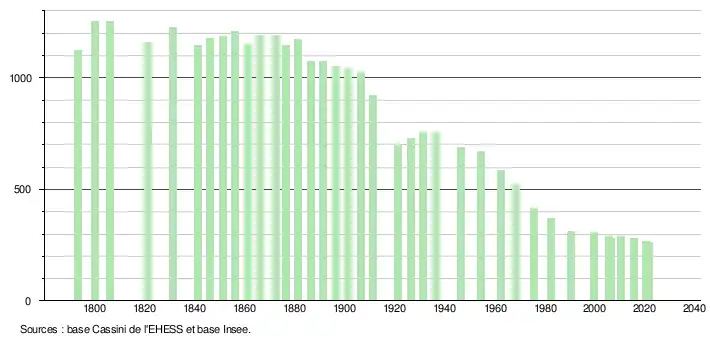 L'évolution du nombre d'habitants est connue à travers les recensements de la population effectués dans la commune depuis 1793. Pour les communes de moins de 10 000 habitants, une enquête de recensement portant sur toute la population est réalisée tous les cinq ans, les populations légales des années intermédiaires étant quant à elles estimées par interpolation ou extrapolation[31]. Pour la commune, le premier recensement exhaustif entrant dans le cadre du nouveau dispositif a été réalisé en 2005[32].