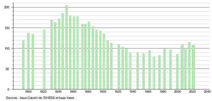 L'évolution du nombre d'habitants est connue à travers les recensements de la population effectués dans la commune depuis 1793. Pour les communes de moins de 10 000 habitants, une enquête de recensement portant sur toute la population est réalisée tous les cinq ans, les populations légales des années intermédiaires étant quant à elles estimées par interpolation ou extrapolation[16]. Pour la commune, le premier recensement exhaustif entrant dans le cadre du nouveau dispositif a été réalisé en 2005[17].