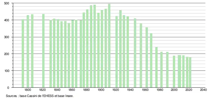 L'évolution du nombre d'habitants est connue à travers les recensements de la population effectués dans la commune depuis 1793. Pour les communes de moins de 10 000 habitants, une enquête de recensement portant sur toute la population est réalisée tous les cinq ans, les populations légales des années intermédiaires étant quant à elles estimées par interpolation ou extrapolation[22]. Pour la commune, le premier recensement exhaustif entrant dans le cadre du nouveau dispositif a été réalisé en 2007[23].
