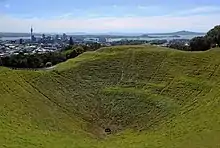 Vue de l'intérieur du cratère du mont Eden avec le centre-ville d'Auckland au second plan.