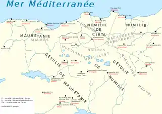 Après l'annexion romaine en 42 ou 43 par l'empereur romain Claude, la Maurétanie est divisée en deux provinces romaines[A 1] :