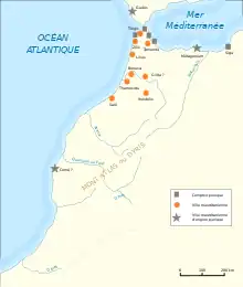 Dès le début du Ier millénaire av. J.-C., la côte méditerranéenne de la Maurétanie, bénéficie de ports de commerce avec les Phéniciens, puis les Puniques de Carthage au IVe siècle av. J.-C.[A 2]. Les tribus berbères, qui se sont établies dans la région dès le début de l'âge du fer contrôle l'intérieur des terres. Mais depuis les comptoirs puniques de Tanger et de Lixus, le commerce va s'intensifier avec les locaux, et la langue punique et ses institutions vont se propager à l'intérieur des terres de la Maurétanie[A 2].