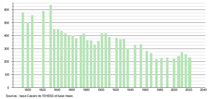 L'évolution du nombre d'habitants est connue à travers les recensements de la population effectués dans la commune depuis 1793. Pour les communes de moins de 10 000 habitants, une enquête de recensement portant sur toute la population est réalisée tous les cinq ans, les populations légales des années intermédiaires étant quant à elles estimées par interpolation ou extrapolation[22]. Pour la commune, le premier recensement exhaustif entrant dans le cadre du nouveau dispositif a été réalisé en 2005[23].