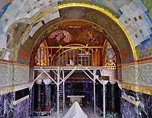 Les voûtes sont entièrement revêtues de mosaïques. Les murs et l'escalier sont recouverts de plaques de marbre; colonnes et chapiteaux sont aussi taillés dans le marbre. Le sol est recouvert d'un carrelage italien en céramique.