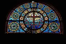 Les coloris des vitraux, uniquement composés de motifs floraux (avec une croix au centre pour les deux principaux) ne prennent toute leur valeur que vus de l'intérieur sous l'effet de la lumière du jour.