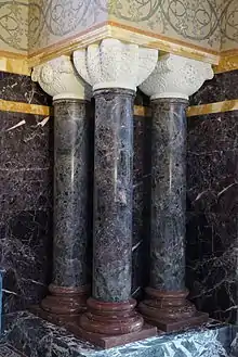 Trois colonnes jumelées se dressent à chaque angle intérieur de la croix grecque. Leur rôle est déterminant et complémentaire, pour définir les surfaces et volumes du carré et des branches de la croix grecque. Elles donnent naissance à la fois aux pendentifs supportant la coupole, à l'arcade de l'abside, à l'arcade du portique et sa voûte, aux arcades des branches Est et Ouest. Le fût des 12 colonnes est en marbre serpentine. Leur base et les tores les ornant sont en porphyre rouge. Les chapiteaux sont en marbre de Carrare et leur sculpture, inspirée du style corinthien, représente des feuilles d'acanthe stylisées.