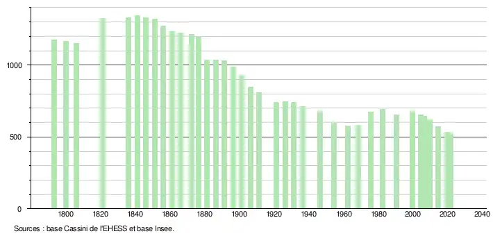 L'évolution du nombre d'habitants est connue à travers les recensements de la population effectués dans la commune depuis 1793. Pour les communes de moins de 10 000 habitants, une enquête de recensement portant sur toute la population est réalisée tous les cinq ans, les populations légales des années intermédiaires étant quant à elles estimées par interpolation ou extrapolation[23]. Pour la commune, le premier recensement exhaustif entrant dans le cadre du nouveau dispositif a été réalisé en 2004[24].