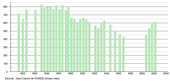 | L'évolution du nombre d'habitants est connue à travers les recensements de la population effectués dans la commune depuis 1793. Pour les communes de moins de 10 000 habitants, une enquête de recensement portant sur toute la population est réalisée tous les cinq ans, les populations légales des années intermédiaires étant quant à elles estimées par interpolation ou extrapolation[24]. Pour la commune, le premier recensement exhaustif entrant dans le cadre du nouveau dispositif a été réalisé en 2006[25]. En 2021, la commune comptait 610 habitants[Note 4], en augmentation de 4,81 % par rapport à 2015 (Lot-et-Garonne : −0,66 %, France hors Mayotte : +1,84 %). |