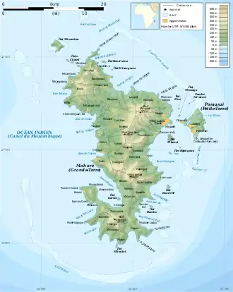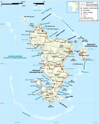 Au plan géographique, Mayotte est un ensemble d'îles situé à l'est de l'archipel des Comores, au nord du canal du Mozambique et au nord-ouest de Madagascar dans l'océan Indien[3],[4],[5],[6],[7]. Mayotte est constituée de deux îles principales, Grande-Terre et Petite-Terre, et de plusieurs autres petites îles dont Mtsamboro, Mbouzi et Bandrélé[8]. Son code départemental officiel est « 976 »[9]. Jusqu’en , Dzaoudzi, situé en Petite-Terre, était le chef-lieu de jure tandis que le chef-lieu de facto était Mamoudzou, sur Grande-Terre, qui est aussi la ville la plus peuplée de Mayotte ; à partir du , Mamoudzou devient le chef-lieu officiel de la collectivité[10],[11],[12]. Le siège du conseil départemental et les services administratifs de la préfecture sont tous deux à Mamoudzou[6]. Du fait de son statut de département et région d'outre-mer, Mayotte est également une région ultrapériphérique de l'Union européenne[13]. Ses habitants sont appelés les Mahorais et les langues locales sont le mahorais (shimaoré) et le shibushi.