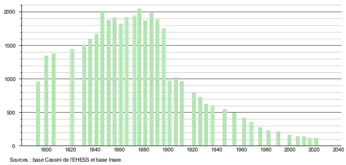 L'évolution du nombre d'habitants est connue à travers les recensements de la population effectués dans la commune depuis 1793. Pour les communes de moins de 10 000 habitants, une enquête de recensement portant sur toute la population est réalisée tous les cinq ans, les populations légales des années intermédiaires étant quant à elles estimées par interpolation ou extrapolation[17]. Pour la commune, le premier recensement exhaustif entrant dans le cadre du nouveau dispositif a été réalisé en 2006[18].