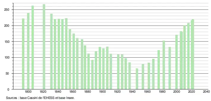 L'évolution du nombre d'habitants est connue à travers les recensements de la population effectués dans la commune depuis 1793. Pour les communes de moins de 10 000 habitants, une enquête de recensement portant sur toute la population est réalisée tous les cinq ans, les populations légales des années intermédiaires étant quant à elles estimées par interpolation ou extrapolation[17]. Pour la commune, le premier recensement exhaustif entrant dans le cadre du nouveau dispositif a été réalisé en 2005[18].