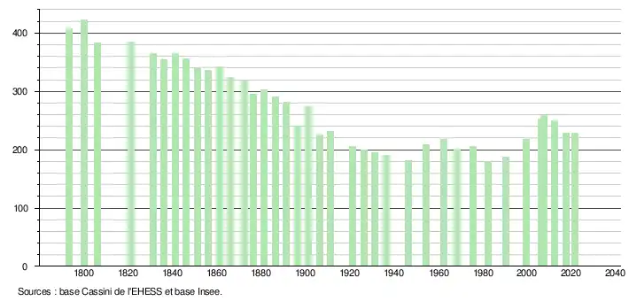 L'évolution du nombre d'habitants est connue à travers les recensements de la population effectués dans la commune depuis 1793. Pour les communes de moins de 10 000 habitants, une enquête de recensement portant sur toute la population est réalisée tous les cinq ans, les populations légales des années intermédiaires étant quant à elles estimées par interpolation ou extrapolation[16]. Pour la commune, le premier recensement exhaustif entrant dans le cadre du nouveau dispositif a été réalisé en 2007[17].