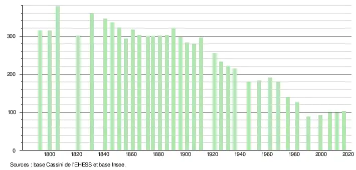 L'évolution du nombre d'habitants est connue à travers les recensements de la population effectués dans la commune depuis 1793. Pour les communes de moins de 10 000 habitants, une enquête de recensement portant sur toute la population est réalisée tous les cinq ans, les populations légales des années intermédiaires étant quant à elles estimées par interpolation ou extrapolation[15]. Pour la commune, le premier recensement exhaustif entrant dans le cadre du nouveau dispositif a été réalisé en 2006[16].