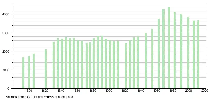 − L'évolution du nombre d'habitants est connue à travers les recensements de la population effectués dans la commune depuis 1793. À partir du , les populations légales des communes sont publiées annuellement dans le cadre d'un recensement qui repose désormais sur une collecte d'information annuelle, concernant successivement tous les territoires communaux au cours d'une période de cinq ans. Pour les communes de moins de 10 000 habitants, une enquête de recensement portant sur toute la population est réalisée tous les cinq ans, les populations légales des années intermédiaires étant quant à elles estimées par interpolation ou extrapolation[18]. Pour la commune, le premier recensement exhaustif entrant dans le cadre du nouveau dispositif a été réalisé en 2006[19],[Note 1].