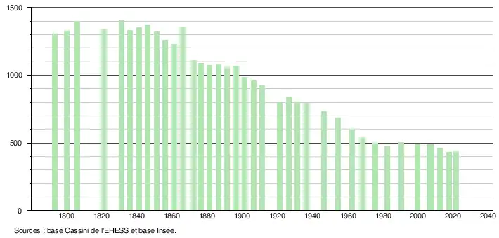 L'évolution du nombre d'habitants est connue à travers les recensements de la population effectués dans la commune depuis 1793. Pour les communes de moins de 10 000 habitants, une enquête de recensement portant sur toute la population est réalisée tous les cinq ans, les populations légales des années intermédiaires étant quant à elles estimées par interpolation ou extrapolation[16]. Pour la commune, le premier recensement exhaustif entrant dans le cadre du nouveau dispositif a été réalisé en 2007[17].