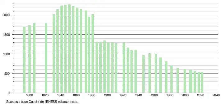 L'évolution du nombre d'habitants est connue à travers les recensements de la population effectués dans la commune depuis 1793. Pour les communes de moins de 10 000 habitants, une enquête de recensement portant sur toute la population est réalisée tous les cinq ans, les populations légales des années intermédiaires étant quant à elles estimées par interpolation ou extrapolation[29]. Pour la commune, le premier recensement exhaustif entrant dans le cadre du nouveau dispositif a été réalisé en 2007[30].