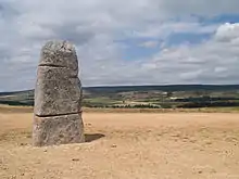 Un des menhirs du site de la Cham des Bondons. À l'arrière-plan, le puech de Mariette. | ||||