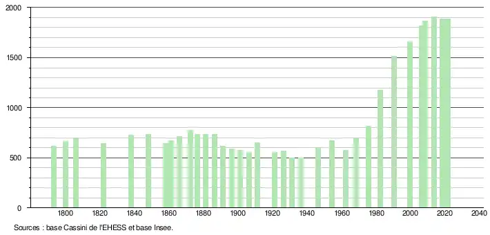 L'évolution du nombre d'habitants est connue à travers les recensements de la population effectués dans la commune depuis 1793. Pour les communes de moins de 10 000 habitants, une enquête de recensement portant sur toute la population est réalisée tous les cinq ans, les populations légales des années intermédiaires étant quant à elles estimées par interpolation ou extrapolation[21]. Pour la commune, le premier recensement exhaustif entrant dans le cadre du nouveau dispositif a été réalisé en 2008[22].