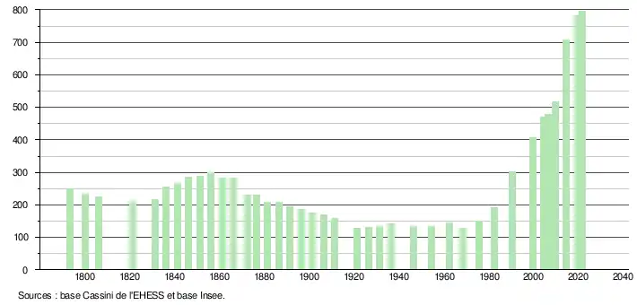 | L'évolution du nombre d'habitants est connue à travers les recensements de la population effectués dans la commune depuis 1793. Pour les communes de moins de 10 000 habitants, une enquête de recensement portant sur toute la population est réalisée tous les cinq ans, les populations légales des années intermédiaires étant quant à elles estimées par interpolation ou extrapolation[31]. Pour la commune, le premier recensement exhaustif entrant dans le cadre du nouveau dispositif a été réalisé en 2004[32]. En 2021, la commune comptait 795 habitants[Note 4], en augmentation de 9,05 % par rapport à 2015 (Haute-Garonne : +7,43 %, France hors Mayotte : +1,84 %). |
