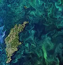 Ondulations de phytoplancton, des algues microscopiques, qui prolifèrent dans la mer Baltique. Photographie de la mission Sentinel-2. La chlorophylle que le phytoplancton utilise pour la photosynthèse teinte collectivement les eaux océaniques environnantes, offrant un moyen de détecter ces minuscules organismes depuis l'espace. Dans la plus grande partie de la mer Baltique, il y a deux floraisons annuelles : la floraison printanière et la floraison des cyanobactéries (aussi appelées algues bleues) à la fin de l'été. La mer Baltique est confrontée à de nombreux problèmes graves, notamment les polluants toxiques, les carences en oxygène des eaux profondes et les efflorescences toxiques de cyanobactéries qui affectent l'écosystème, l'aquaculture et le tourisme. Les cyanobactéries ont des qualités similaires à celles des algues et se développent grâce au phosphore présent dans l'eau. Les températures élevées de l'eau et le temps ensoleillé et calme entraînent souvent des floraisons particulièrement importantes qui posent des problèmes à l'écosystème. Sur cette image prise le 20 juillet 2019, les stries, les tourbillons et les tourbillons des fleurs de la fin de l'été, mélangés par les vents et les courants, sont clairement visibles. Sans mesures in situ, il est difficile de distinguer le type d'algues qui recouvre la mer, car de nombreux types d'algues différents poussent dans ces eaux. Les plus fortes concentrations d'efflorescences algales se trouveraient dans la Baltique centrale et autour de l'île de Gotland, visible à gauche sur l'image. Bien que les efflorescences algales soient une partie naturelle et essentielle de la vie dans la mer, l'activité humaine augmente le nombre d'efflorescences annuelles : les eaux de ruissellement agricoles et industrielles déversent des engrais dans la mer, fournissant ainsi les nutriments supplémentaires dont les algues ont besoin pour former de grandes fleurs d'eau. Les bactéries qui consomment les plantes en décomposition aspirent l'oxygène de l'eau, créant ainsi des zones mortes où les poissons ne peuvent pas survivre.