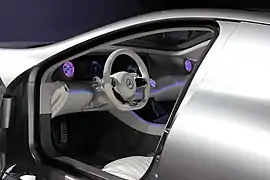 Le luxueux intérieur est réalisé en aluminium, cuir, verre poli, et néons, avec toit vitré panoramique, tableau de bord à écran tactile entièrement numérique, et nombreux contrôles tactiles (dont l'ouverture des portières automatiques sans poignée...).