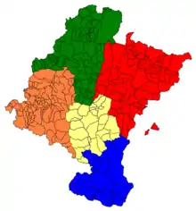 Toutefois après l'approbation de la loi d'Amejoramiento du for (LORAFNA[12]) ont disparu les districts et le Parlement de Navarre est formé par 50 membres (le numéro de membre est réglé par une loi statutaire (forale) et ne peut pas être supérieur à 60 ni inférieur à 40) qui sont élus par représentation proportionnelle[13]. Les mérindades sont toutefois considérées dans cette loi de la manière suivante :
