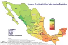 L'idéologie du Métissage, qui a brouillé les lignes de démarcation entre les races au niveau institutionnel, a également eu une influence significative sur les études génétiques réalisées au Mexique[77]. Comme les critères utilisés dans les études pour déterminer si un Mexicain est métis ou indigène reposent souvent sur des traits culturels tels que la langue parlée plutôt que sur l'auto-identification raciale ou sur une sélection basée sur le phénotype, certaines études montrent que les populations considérées comme indigènes en raison de la langue parlée présentent un degré plus élevé de mélange génétique européen que les populations considérées comme métisses dans d'autres études[79]. L'inverse se produit également, puisqu'il existe des cas où des populations considérées comme métisses présentent des fréquences génétiques très similaires à celles des peuples d'Europe continentale dans le cas des métis de l'État de Durango[28] ou à celles des Américains d'origine européenne dans le cas des Métis de l'État de Jalisco[80].