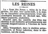 - « Tous nos lecteurs savent qu'il est d'usage, à Paris, d'élire à l'occasion de la fête de la Mi-Carême, une reine dans chaque lavoir ; on choisit de même une reine du (marché du) Temple et une reine des Halles.