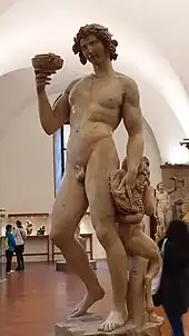 Il arrive à Rome le . Le jour même jour, le cardinal lui montre ses sculptures anciennes, lui demandant s'il a envie de faire quelque chose de similaire. Dix jours plus tard, l'artiste commence à sculpter une statue en plein-relief d'un Bacchus (aujourd'hui au musée national du Bargello), représenté comme un adolescent ivre, dans lequel l'influence de la statuaire classique est déjà lisible : l'œuvre présente un rendu naturaliste du corps, avec des effets illusoires et tactiles proches de ceux de la sculpture hellénistique ; l'expressivité et l'élasticité des formes, combinées en même temps à une simplicité essentielle des détails est sans précédent pour l'époque. Il sculpte un jeune homme qui vole quelques raisins de la main du dieu aux pieds de Bacchus : ce geste suscite beaucoup d'admiration chez tous les sculpteurs de l'époque puisque le jeune homme semble vraiment manger le raisin, avec un grand réalisme. Bacchus est l'une des rares œuvres parfaitement finies de Michel-Ange et d'un point de vue technique, il marque son entrée dans la maturité artistique[53].