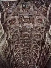 En 1487, Michel-Ange rejoint l'atelier de Domenico Ghirlandaio, l'un des artistes florentins les plus populaires de l'époque[17]. Pendant l'enfance de Michel-Ange, une équipe de peintres avait été appelée de Florence au Vatican pour décorer les murs de la Chapelle Sixtine. Domenico Ghirlandaio, un maître de la peinture à fresque, de la perspective, du dessin de figures et du portrait, qui possédait le plus grand atelier de Florence, en faisait partie[19].