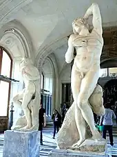 Léonard de Vinci manifeste son intérêt pour David, le copiant dans son propre dessin (bien qu'il ne puisse pas partager la forte musculature de l'œuvre), mais Michel-Ange est également influencé par l'art de Léonard. En 1501, le maître de Vinci expose dans la basilique de la Santissima Annunziata un carton avec Sainte Anne avec la Vierge, l'Enfant et l'agneau (perdu), qui « ne fit pas seulement l'admiration des artistes. Dans la salle où il l'avait achevé, il y eut deux jours durant un défilé d'hommes et de femmes, jeunes et vieux, pour le voir.[69] » Michel-Ange lui-même a vu le carton, et est peut-être impressionné par les nouvelles idées picturales d'enveloppement atmosphérique et d'indétermination spatiale et psychologique ; il est presque certain qu'il l'a étudié, comme le montrent les dessins de ces années, avec des traits plus dynamiques, une plus grande animation des contours et une plus grande attention au problème du lien entre les figures, souvent résolu par des groupes articulés dynamiquement. La question de l'influence de Léonard est un sujet controversé parmi les savants, mais certains d'entre eux en ont lu les traces dans les deux séries de sculptures qu'il exécute dans les années qui suivent immédiatement[70]. Deux des innovations stylistiques de Léonard assumées et faites siennes dans le style de Michel-Ange sont largement reconnues : la construction pyramidale des figures humaines, importante par rapport aux fonds naturels, et le « contrapposto », porté au degré maximum par Michel-Ange, qui rend les personnages dynamiques et dont on voit les membres partir dans des directions spatiales opposées.