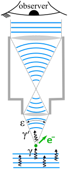 Un observateur perçoit une image de la particule parce que les rayons lumineux frappent la particule et rebondissent à travers le microscope vers l'œil de l'observateur. Nous savons par des preuves expérimentales que lorsqu'un photon frappe un électron, ce dernier a un recul Compton avec une Quantité de mouvement proportionnelle à , où est la constante de Planck. Cependant, l'étendue du "recul ne peut pas être connue avec précision, car la direction du photon diffusé est indéterminée dans le faisceau de rayons entrant dans le microscope" [réf. nécessaire]. En particulier, la quantité de mouvement de l'électron dans la direction n'est déterminée que jusqu'à[6]