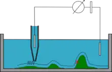 Une différence de potentiel est appliquée entre les deux électrodes Ag/AgCl, l'une étant dans la micro-pipette et l'autre dans le réservoir de solution. Cette différence de potentiel génère un courant ionique, donc un flux d'ions entrant et sortant de la micro-pipette. La conductance (et indirectement la résistance) entre les deux électrodes est mesurée, et dépend du flux d'ions en solution.