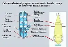 Les colonnes électroniques montées avec des canons à émission de champ peuvent avoir une réduction de la source bien inférieure à celle des colonnes conventionnelles[19].