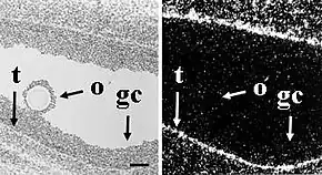La microscopie en champ sombre peut aussi être utilisée pour mettre en évidence des particules métalliques dans des coupes de tissus[25] (voir aussi fig. 17).