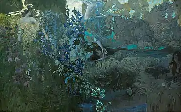 Vroubel est le plus marquant des peintres russes que l'on peut qualifier de symboliste[79]. Il en est considéré par les symbolistes eux-mêmes comme l'un des précurseurs. Il anticipe à la fois Mir iskousstva et le symbolisme littéraire. Alors que le terme même de symbolisme est utilisé par Jean Moréas en 1886 , les premières œuvres de Vroubel datent de 1880. Le peintre russe s'inscrit donc dans le courant de la peinture représenté par Arnold Böcklin, Fernand Khnopff, Félicien Rops ou Franz von Stuck. Rejetant le naturalisme et le matérialisme, Vroubel contribue au retour de la spiritualité dans un cadre plus large que la tradition chrétienne. Vroubel s'inspire des traditions littéraires (Le Démon de Lermontov, Faust, Hamlet et musicales (Rimski-Korsakov). Également des figures du folklore (Pan, La Princesse cygne). Son ornementalisme Art nouveau se retrouve dans les attributs des personnages (plumes, vêtements, chevelure) et dans la nature luxuriante qui les entoure[78].