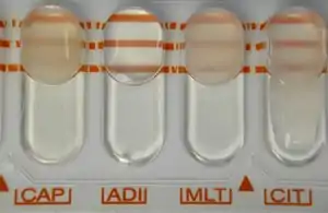 - soit le milieu est semi-solide et utilisé dans les galeries API, les cupules de cette dernière contiennent les glucides ou d'autres sources de carbone à étudier. Observer alors la culture dans la cupule (en général dans la zone aérobie de la cupule pour la galerie API20NE). Galerie API 20NE - partie auxanogramme - Pascal FRAPERIE CAP = acide caprique (décanoïque) ADI = acide adipique MLT = acide malique CIT = acide citrique Galerie API 20NE - partie auxanogramme - Pascal FRAPERIE CAP = acide caprique (décanoïque) ADI = acide adipique MLT = acide malique CIT = acide citrique Candida albicans en galerie API20C Aux - S. Droguet Candida albicans en galerie API20C Aux - S. Droguet
