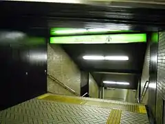 La station dispose de neuf accès équipés d'escalier et de deux ascenseurs, permettant le lien entre la surface et les halls ouest et est du niveau -1. Les deux halls de billetterie et contrôle n'ont pas de lien direct entre eux au niveau -1. Le hall est dispose d'escaliers mécaniques pour rejoindre le quai au niveau -2. Le hall ouest est également équipé d'escaliers mécaniques pour rejoindre le quai au niveau -2, par ailleurs l'accessibilité de la station au personnes à la mobilité réduite passe par ce hall qui dispose aussi d'un ascenseur pour le niveau -2[2].