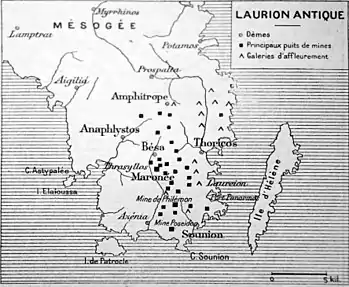 À l'époque antique, l'exploitation des gisements du Laurion était très morcelée[N 17] : il y avait au moins 500 mines différentes en activité dans les années 340 selon G. G. Aperghis[60]. On peut supposer que ces concessions étaient de tailles très variées, aptes à répondre aux désirs d'investissement des plus obscurs comme des plus riches des Athéniens : aussi bien le vendeur d'andouilles d'Aristophane[61] qu'Épicrate de Pallène, « qui avait pour associés les hommes les plus riches, ou presque, d'Athènes[62] ».