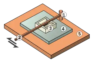 Les galeries étaient étroites (50 à 60 cm de largeur, 60 à 90 cm de hauteur), ce qui ne facilitait ni le travail et la circulation des mineurs, ni l'évacuation du minerai abattu. Quand les excavations étaient plus grandes, les ouvriers laissaient subsister des portions de roches pauvres en minerai qui servaient de piliers (ormos). On pouvait aussi, localement, avoir recours au soutènement par boisage, comme le démontrent nos sources littéraires et archéologiques[N 38], même si cela était loin d'être la règle : la faible largeur des galeries permettait le plus souvent de limiter les risques d'effondrement ; elle rendait en outre la progression plus rapide[N 39]. Les mineurs attaquaient le front de taille en creusant des mortaises de 12 cm de large sur toute la hauteur de la galerie. Au bout de cinq mortaises, l'ensemble de la galerie, large de 60 cm, avait progressé de la profondeur de ces mortaises. Un tel travail prenait environ dix heures, ce qui correspond au rythme de rotation des équipes, et à la capacité d'éclairage des lampes : Édouard Ardaillon en conclut qu'une telle organisation était délibérée car elle permettait au supérieur hiérarchique de constater la bonne marche du travail et de sanctionner éventuellement les mineurs trop peu performants[111]. Au bout d'un mois, la galerie s'était ainsi enfoncée de dix mètres[112].