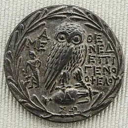 Le fait qu'en 408, d'après les comptes de construction du temple de l'Athéna Poliade, le plomb se vende 5 drachmes le talent de commerce (environ 36 kg)[20] contre 2 drachmes dans les années 330/320[21], période d'intense exploitation des mines, est un indice supplémentaire de l'arrêt quasi complet de production d'argent et de plomb au Laurion à ce moment-là. Le manque d’argent de l’État athénien se lit d’ailleurs dans les expédients utilisés à la fin de la guerre : en 407, « comme depuis six ans les mines ne donnaient plus rien[22] », la cité utilisa les Victoires (Nikai) en or de l'Acropole pour battre monnaie, et, en 406, elle émit pour la première fois, malgré les récriminations d'Aristophane, de « méchantes pièces de bronze, frappées hier ou avant-hier au plus mauvais coin[23] ».