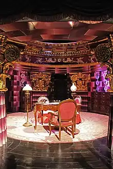 La salle du tribunal, visible lors de l'interrogatoire d'Igor Karkaroff dans Harry Potter et la Coupe de feu, s'inspire de l'art byzantin[17], rehaussée de feuilles d'or et de marbrures (papiers marbrés faits main le cas présent, tout comme pour le décor de l'échiquier du premier film[17]). Le style choisi s'oppose au gothique jusqu'alors très présent dans de nombreux décors de la série. On y trouve également des fresques semblables à celles des églises byzantines, mais racontant l'« histoire des sorciers »[18]. La cage présente au centre de la salle rappelle volontairement les vierges de fer du Moyen Âge[18]. Dans Harry Potter et l'Ordre du Phénix, le décor de cette salle est repensé et agrandi. Son style devient semblable à celui de l'atrium.