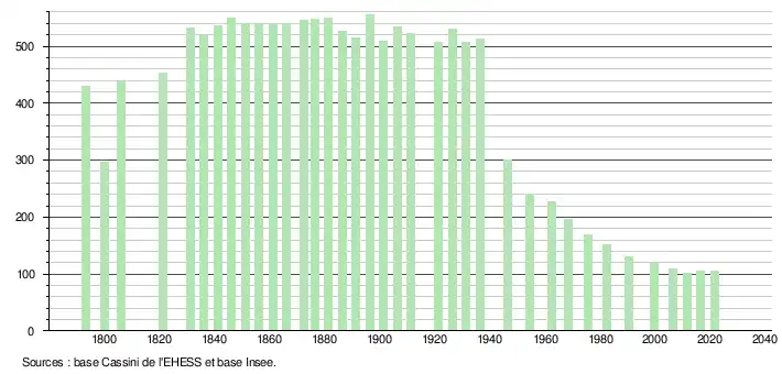| L'évolution du nombre d'habitants est connue à travers les recensements de la population effectués dans la commune depuis 1793. Pour les communes de moins de 10 000 habitants, une enquête de recensement portant sur toute la population est réalisée tous les cinq ans, les populations légales des années intermédiaires étant quant à elles estimées par interpolation ou extrapolation[27]. Pour la commune, le premier recensement exhaustif entrant dans le cadre du nouveau dispositif a été réalisé en 2006[28]. En 2021, la commune comptait 106 habitants[Note 4], en augmentation de 3,92 % par rapport à 2015 (Tarn : +1,82 %, France hors Mayotte : +1,84 %). |