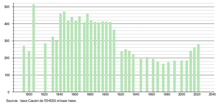 L'évolution du nombre d'habitants est connue à travers les recensements de la population effectués dans la commune depuis 1793. Pour les communes de moins de 10 000 habitants, une enquête de recensement portant sur toute la population est réalisée tous les cinq ans, les populations légales des années intermédiaires étant quant à elles estimées par interpolation ou extrapolation[44]. Pour la commune, le premier recensement exhaustif entrant dans le cadre du nouveau dispositif a été réalisé en 2006[45].