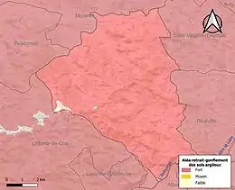 Le retrait-gonflement des sols argileux est susceptible d'engendrer des dommages importants aux bâtiments en cas d’alternance de périodes de sécheresse et de pluie. 99,4 % de la superficie communale est en aléa moyen ou fort (92 % au niveau départemental et 48,5 % au niveau national). Sur les 492 bâtiments dénombrés sur la commune en 2019, 487 sont en aléa moyen ou fort, soit 99 %, à comparer aux 96 % au niveau départemental et 54 % au niveau national. Une cartographie de l'exposition du territoire national au retrait gonflement des sols argileux est disponible sur le site du BRGM[29],[Carte 3].