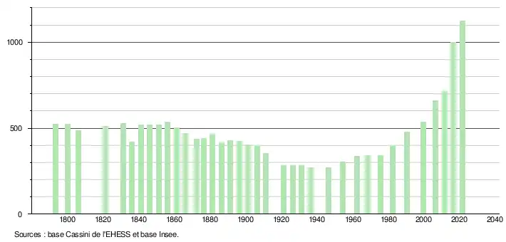 L'évolution du nombre d'habitants est connue à travers les recensements de la population effectués dans la commune depuis 1793. Pour les communes de moins de 10 000 habitants, une enquête de recensement portant sur toute la population est réalisée tous les cinq ans, les populations légales des années intermédiaires étant quant à elles estimées par interpolation ou extrapolation[38]. Pour la commune, le premier recensement exhaustif entrant dans le cadre du nouveau dispositif a été réalisé en 2006[39].