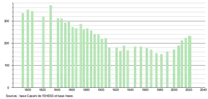 | L'évolution du nombre d'habitants est connue à travers les recensements de la population effectués dans la commune depuis 1793. Pour les communes de moins de 10 000 habitants, une enquête de recensement portant sur toute la population est réalisée tous les cinq ans, les populations légales des années intermédiaires étant quant à elles estimées par interpolation ou extrapolation[23]. Pour la commune, le premier recensement exhaustif entrant dans le cadre du nouveau dispositif a été réalisé en 2005[24]. En 2021, la commune comptait 231 habitants[Note 3], en augmentation de 3,59 % par rapport à 2015 (Gers : +0,79 %, France hors Mayotte : +1,84 %). |