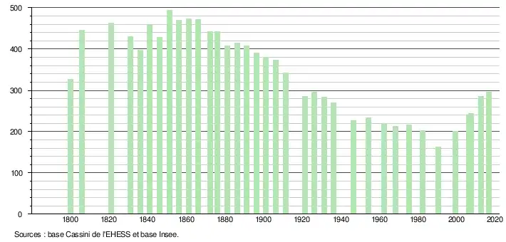L'évolution du nombre d'habitants est connue à travers les recensements de la population effectués dans la commune depuis 1800. Pour les communes de moins de 10 000 habitants, une enquête de recensement portant sur toute la population est réalisée tous les cinq ans, les populations légales des années intermédiaires étant quant à elles estimées par interpolation ou extrapolation[4]. Pour la commune, le premier recensement exhaustif entrant dans le cadre du nouveau dispositif a été réalisé en 2007[5].